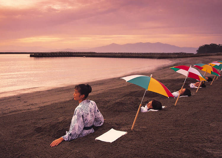 La plaja Ibusuki, băile de nisip cu aburi vă permit să stați întins în nisip, în timp ce aburul fierbinte geotermal de dedesubt vă încălzește. Întinde-te pe plajă în haine yukata; un însoțitor va folosi o lopată pentru a vă îngropa până la gât, apoi vă veți relaxa în timp ce nisipul vă încălzește corpul, ușurându-vă circulația. În timp ce stai întins fără distracție, sunetele valurilor fac experiența excepțional de atrăgătoare.
