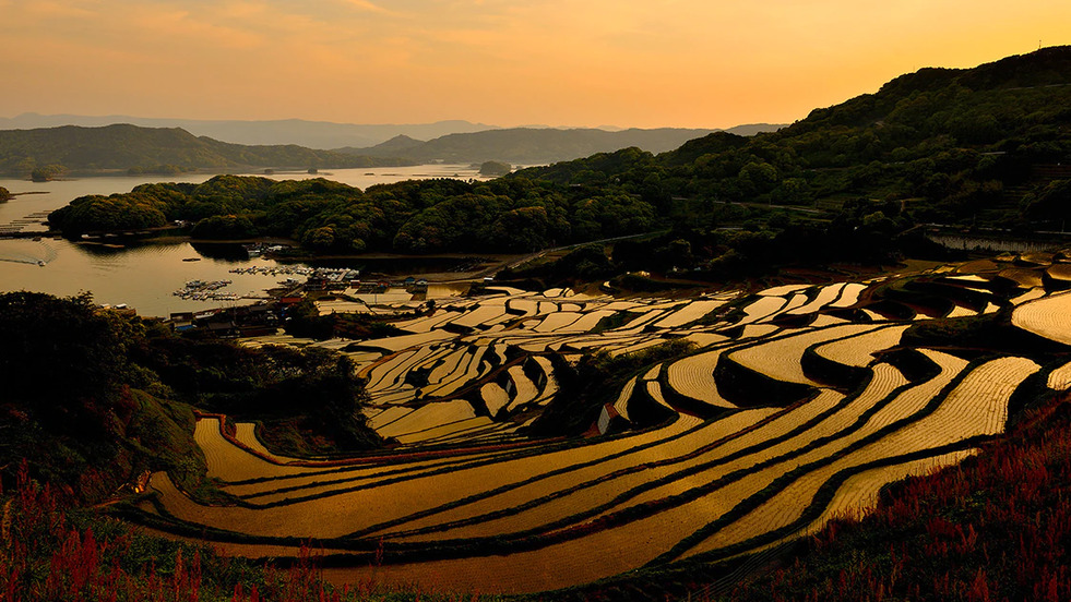 Terasele de orez Hamanoura conțin 283 de câmpuri de orez de diferite dimensiuni. Se umplu cu apă în luna mai, creând o scenă liniștită, uimitoare, cu soarele reflectându-se în apă seara. Terasele de orez sunt considerate un loc foarte romantic.